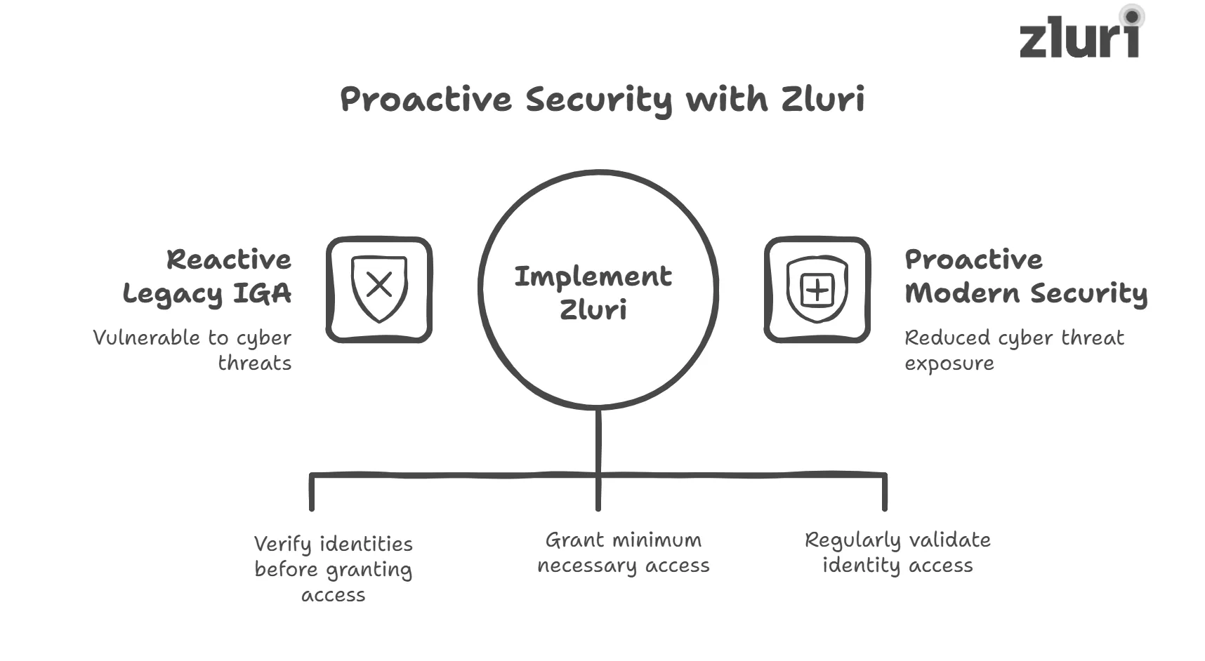 Unlike legacy IGA, which relies on a reactive approach, Zluri follows a proactive approach – i.e., meeting modern security standards.