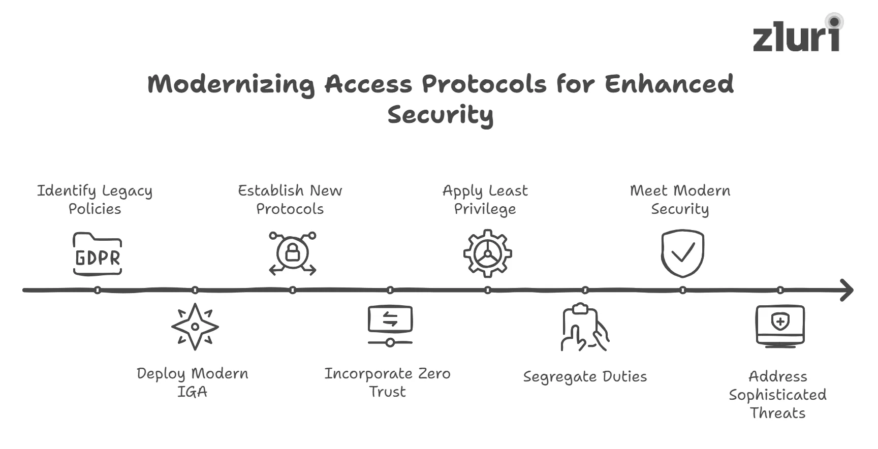 Your legacy access policies aren't meant for the zero trust world. Once your modern IGA is deployed, establish new protocols that align with today's security and compliance standards.